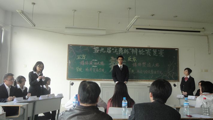 口才之能尽在辩析,智慧之风尽在评论.11月5日下午3点,第九届“工商杯”辩论赛复赛在主校07410教室热烈开辩.本次复赛由校团委主办,由公司作为正方与社管学院就“媒体淡化人格”和“媒体塑造人格”展开一场精彩的唇枪舌剑.