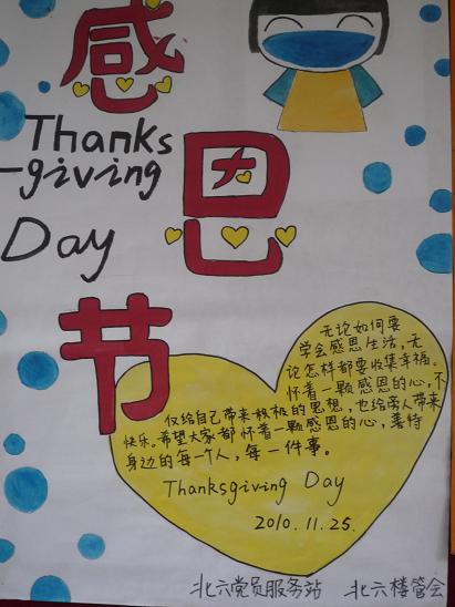 11月25日是今年11月的第四个星期四,在这一天,大洋彼岸的美国朋友们正在庆祝传统的感恩节。因为不少的高校员工也加入了过感恩节的行列,北6党员服务站联合北6楼管会在北6楼栋内进行了感恩节的感恩宣传。
