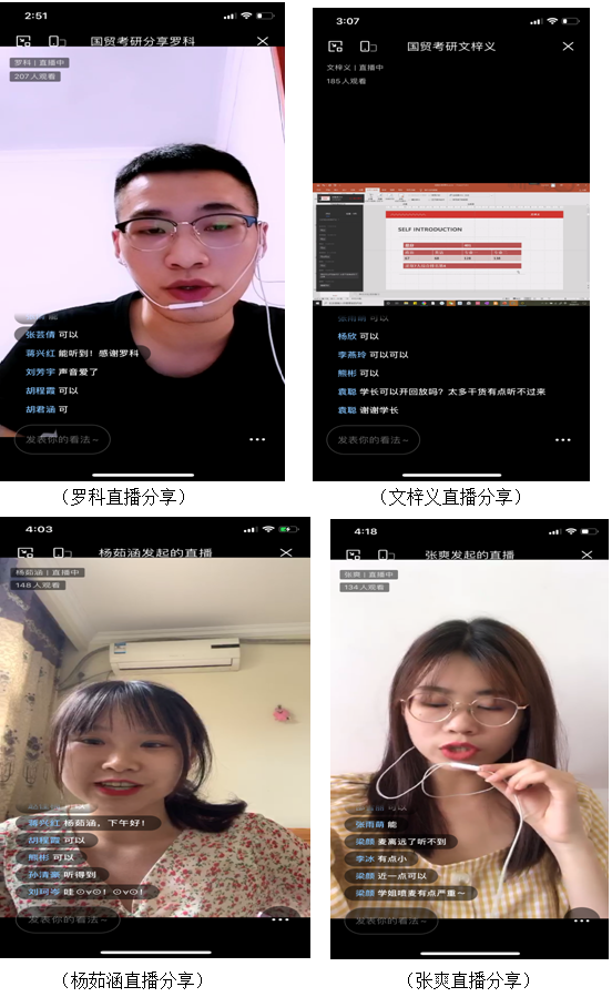 另外5位员工来到线上交流会,采取企业微信直播+群聊模式面对面与学弟学妹们进行分享。他们分别结合自己的切身经历为同学们讲述了宝贵的经验与教训。罗科介绍了自己对择校和选专业的理解,并用自己亲身经历,提出确立目标时要结合自身实际,并不一定非要选择名校,希望大家可以多了解自身和院校后尽早确立目标。文梓义和黄洁妍作为跨考成功的范例,各自介绍了经验,文梓义紧密围绕跨考,以“考研,选择比努力更重要?”的问题为导向,以自己成功跨考“985”、“211”高校-华东师范大学为例,分享了自己跨考专业、学校选取的经验;黄洁妍则重点介绍了跨考法律专业的具体学习方法,指出考研路上最重要的是好的心态,找研友不失为一个很好的方法。杨茹涵和张爽则重点针对国贸专业员工报考国际商务、世界经济等高度相关专业进行了经验介绍,杨茹涵特别介绍了自己正式报名前根据实际水平调整报考院校的经验,并重点推荐学弟学妹们报考国际商务学硕或专硕。