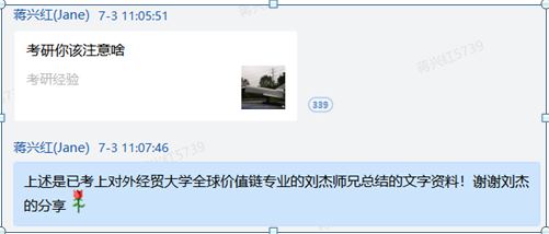本次交流会,采取两种模式进行:一种是线上文字交流,不方便线上即时交流的刘杰、王雪、谢沈益三位同学通过文字总结,分别与学弟学妹们分享了各自默默努力考上对外经贸大学全球价值链专业,经历考研调剂的心路历程以及短期突击考研,虽未成功但可圈可点的考研历程。