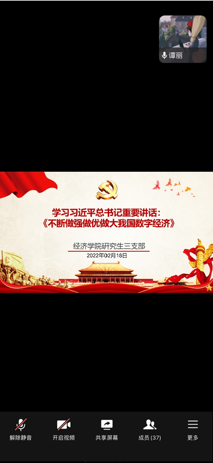 首先,支部书记薛晶月重点解读了《不断做强做优做大我国数字经济》一文。她谈到,这篇文章深刻阐明了发展数字经济的重大意义,科学总结我国数字经济发展的显著成就和主要问题,对发展我国数字经济提出一系列明确要求。接着,分享人谭丽同志从数字经济的概念、我国数字经济的发展现状、十四五规划中的具体部署以及发展数字经济的意义四个方面详细阐述了习近平主席的讲话精神。数字经济是我国把握新机遇的战略选择,也是推动当今中国经济稳健发展的必然选择。随后,支部党员同志就学习内容进行交流。张路同志表示,作为一名共产党员,应不断强化自己的专业水平,提高数字经济思维能力和专业素质,紧跟数字经济的发展,为推动我国数字经济高质量发展贡献自己的力量。