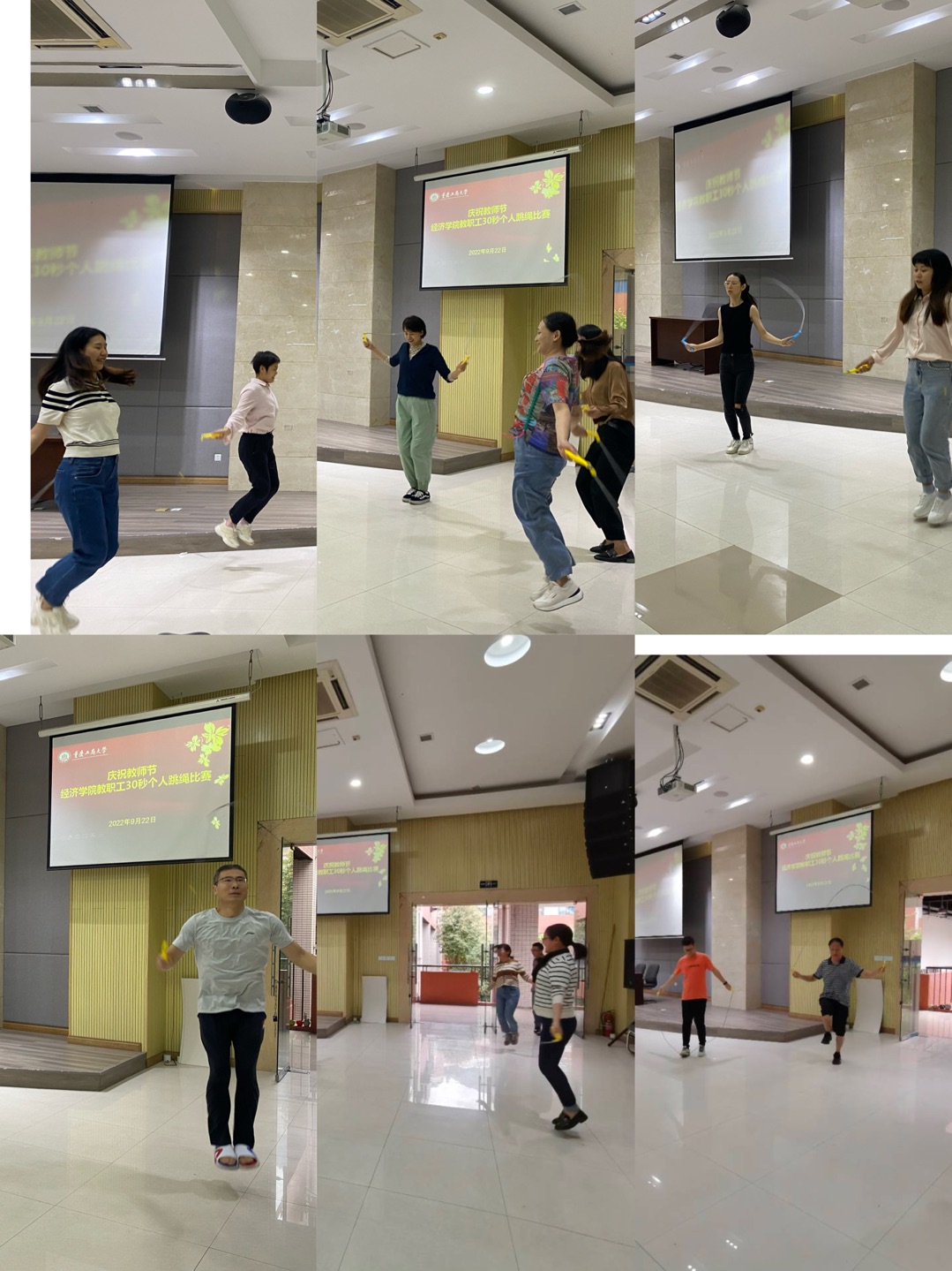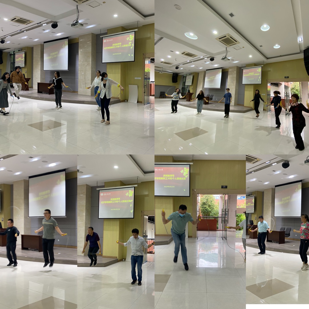 9月22日下午,田家炳408活动室热闹非凡,公司教职工在这里参加由学院工会组织的庆祝教师节教职工快乐跳绳活动,全院90余名老师参加了活动,分5-7人一组陆续进场,30秒计时比赛,最后按计时跳绳个数排序确定比赛成绩。老师们不分性别和年龄,不计输赢,积极踊跃,重在参与,整个活动氛围欢乐融洽。
