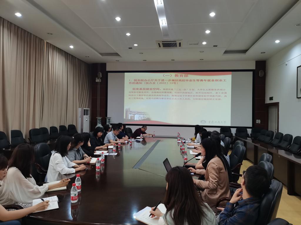 第二阶段,毕业生就业现状总结。本科生毕业班辅导员喻智成同志、张涛同志和研究生毕业班辅导员蒋燕同志就毕业班员工就业情况进行分析,谈到员工内生求职动力不足,就业主动性和急迫性待提高;希望多层面多角度督促员工,加强员工求职动力;提倡一对一与员工交流,提供针对性帮扶。