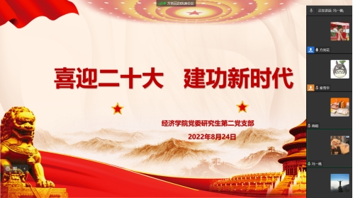 2022年8月24日,委研究生第二党支部全体党员在企业微信线上开展了2022年8月专题学习。本次组织生活会会的学习内容为“喜迎二十大 建功新时代”,由方刘花同志主持,她带领支部全体党员进行了五个部分的专题学习。
