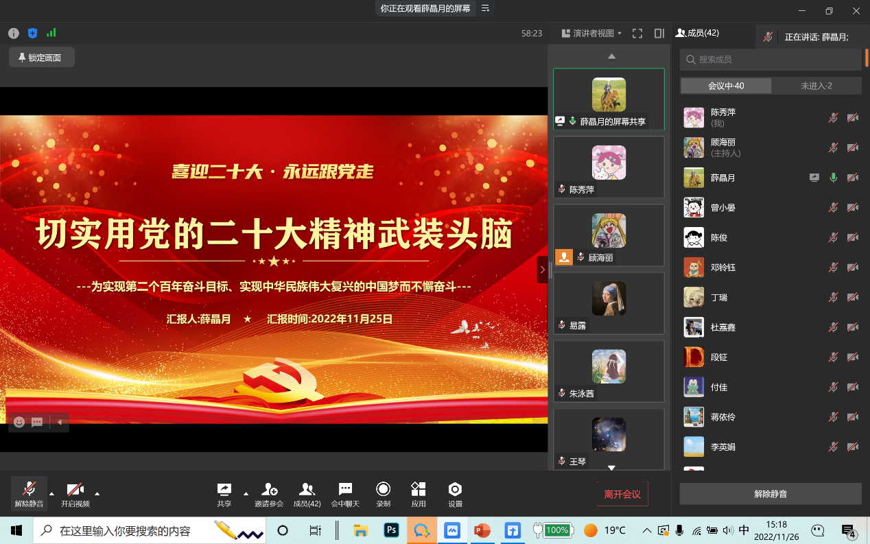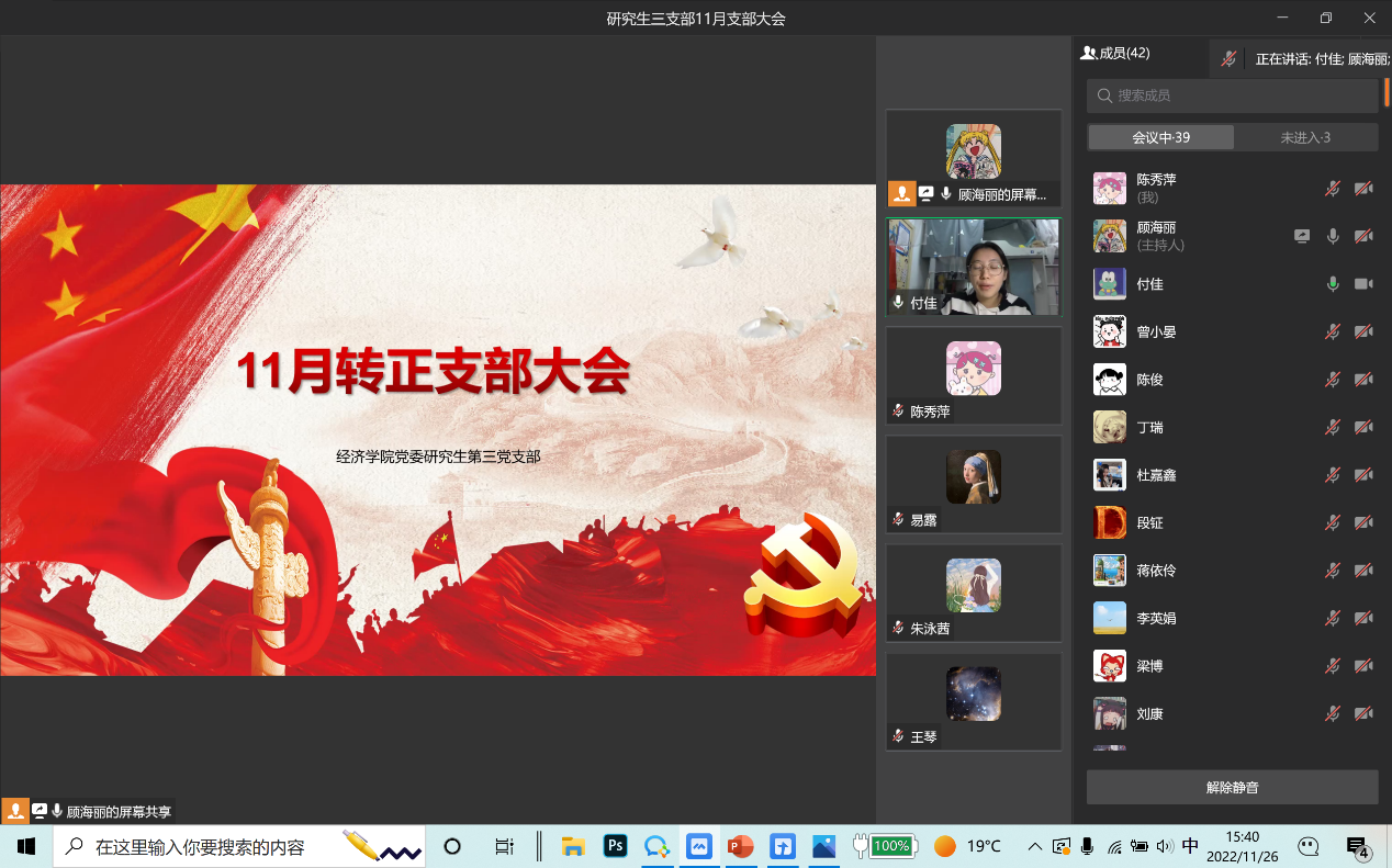2022年11月26日,英国上市公司365研究生第三党支部通过企业微信线上会议召开了11月支部大会,会议内容包括支部书记讲党课事宜、预备党员转正以及讨论接收预备党员事宜。本次会议由支部书记薛晶月主持,研究生三支部全体党员参加。
