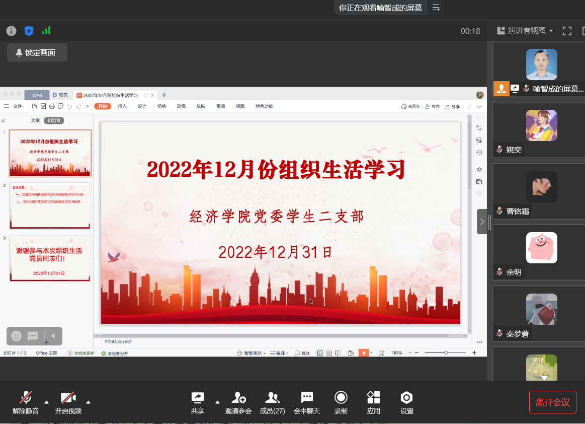 本次会议分为两个阶段,第一阶段为20级党小组代表领学12月份组织生活学习内容,首先由姚奕小组领学人党员代表刘路遥同学带领大家领学《习近平在二十国集团领导人第十七次峰会第一阶段会议上的讲话(全文)》的重点内容,共迎时代挑战,共建美好未来。然后,由谢桂兰小组领学人党员代表余明同学领学《中共中央政治局常务委员会11月10日会议精神》,分析疫情防控形势,研究部署防控工作。最后,由赵露佳小组领学人党员代表赵露佳领学《习近平在党的十九届七中全会第二次全体会议上的讲话》,其中讲到党员要起到先锋模范作用,带领全国全民族实现新阶段发展的胜利。会议第二阶段为19级党小组代表分享12月份组织生活学习,首先由秦鸿小组分享人李小娟为大家分享《习近平在二十国集团领导人第十七次峰会第一阶段会议上的讲话(全文)》,其中讲到发展,是习近平主席这篇讲话最醒目的关键词,也是实现“共同复苏、强劲复苏”最关键的驱动力,聚焦“发展”是本届峰会的使命和职责所在。然后由李星宇小组分享人李卿尔分享《习近平在<湿地公约>第十四届缔约方大会开幕式上的致辞(全文)》,谈到保护湿地的重要性,要推进可持续发展,共同努⼒,谱写全球湿地保护新篇章。最后由陈红旭小组分享人贺耀红分享《习近平在第五届中国国际进口博览会开幕式上的致辞》的重点内容,谈到在对外方面要践行真正的多边主义,凝聚更多开放共识。
