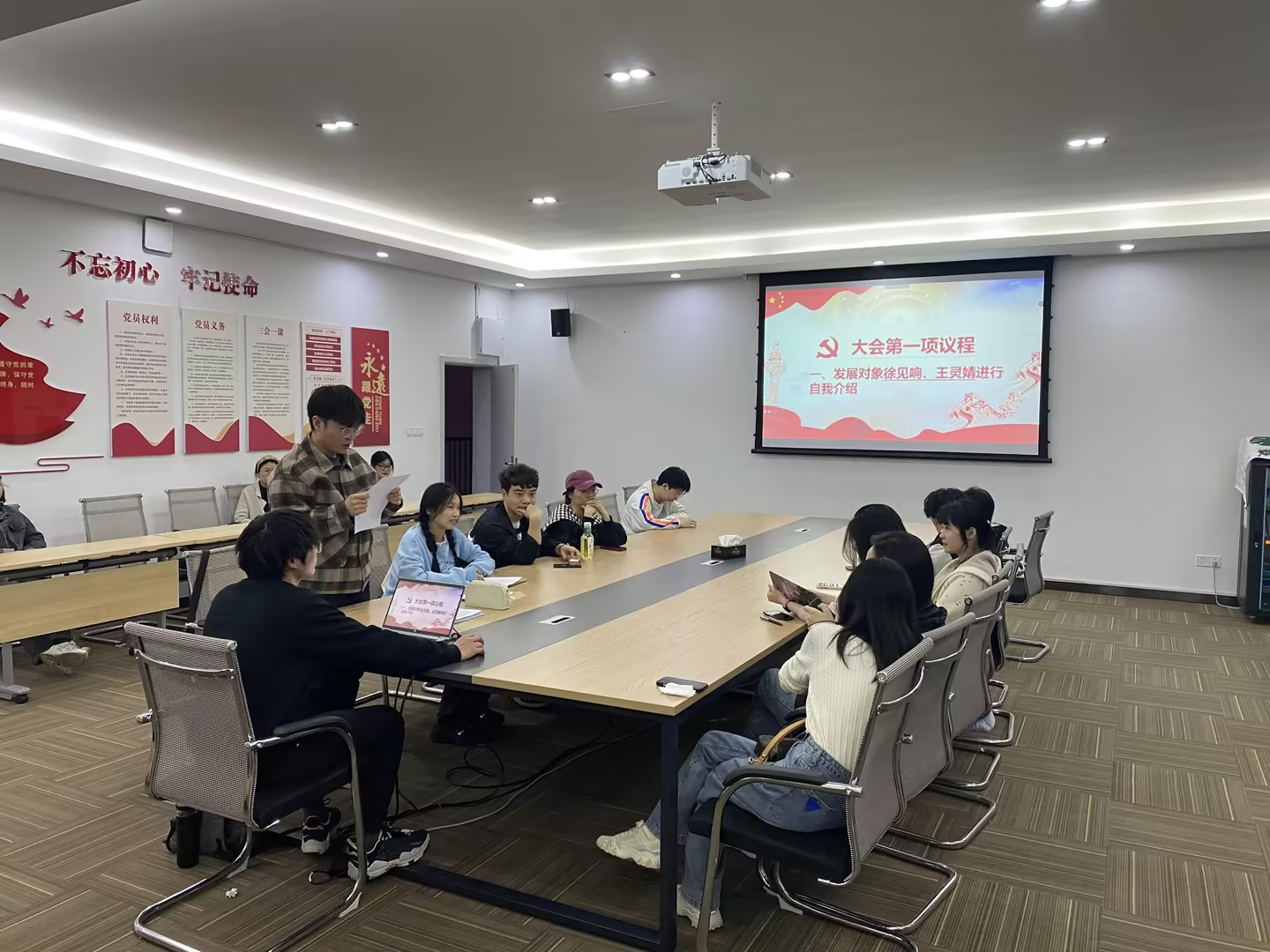 第一阶段党员大会,主要讨论发展对象徐见响、王灵婧发展为预备党员事宜。大会经过发展对象自我介绍、入党介绍人谈发展对象情况并表明意见、纪律委员姚梦寒报告审查情况、在监票人姚梦寒、计票人张艳清的监督下支部正式党员无记名投票表决等一系列严肃的流程,最终统战委员何建宣读大会决议,支部同意徐见响、王灵婧同志发展为预备党员。