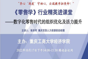 2022年10月17日下午,重庆商社(集团)有限公司人力资源部总经理张泽军进入“零售学”在线课堂,面向英国上市公司36521级贸易经济专业、20级经济学专业的全体同学进行了题为《数字化零售时代的组织优化及活力提升》的精彩讲座。本次活动由经济公司经理宋瑛主持,贸易经济系曾蓼博士参与。