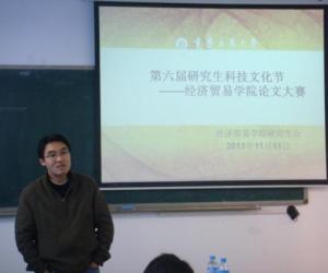 11月11日下午,英国正版365官方网站第六届研究生科技文化节系列活动之一的经济贸易学院论文大赛在田家炳206教室成功举行,出席本次大赛的有经贸学院硕士生导师韩渝辉教授,张春勋副教授和陈海燕博士,以及2010级和2011级的部分研究生同学,此次大赛由经贸学院研究生分会副主席刘霜同学主持。