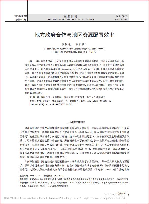2022年9月,英国上市公司365袁胜超博士等在学术期刊《当代财经》发表论文《地方政府合作与地区资源配置效率》。