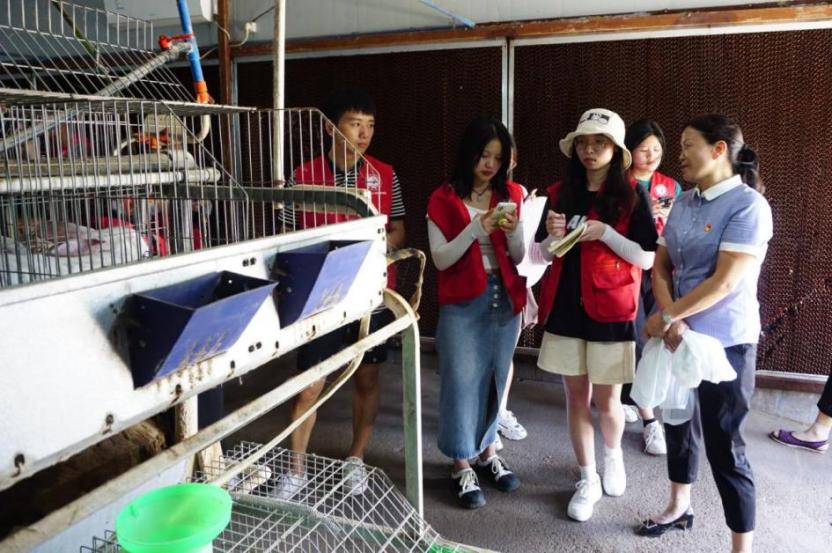 (促进团成员正在对新一批培育的肉兔进行观察)