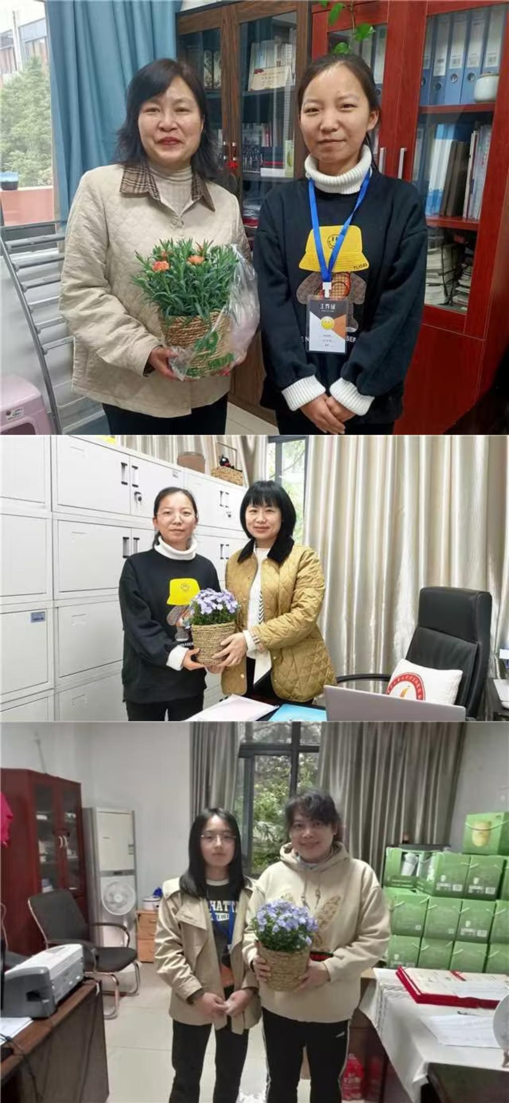 上午十点,献花活动正式开始。员工助理们利用课间时间将鲜花盆栽搬到办公室,分成若干小组为李自维书记,宋瑛经理,雷菁组织员,尹元福副经理,白海龙副书记以及各个办公室的老师献上鲜花盆栽,并合影留念。献花过程中,每位老师都真切地感受到了员工助理们浓浓的情意,老师们接过鲜花,不仅是惊喜和感动,更多的还是幸福。朵朵鲜花传真情,句句祝福暖师心。当芬芳的鲜花和老师们的笑脸融汇在一起,办公室里洋溢的是一片温馨和甜蜜。