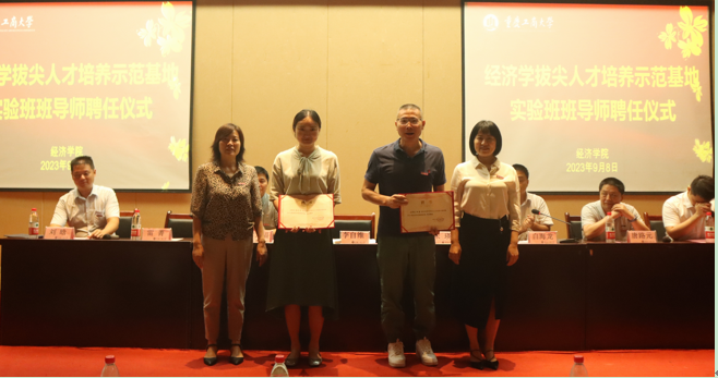 通过在全校2023级同学们当中进行二次选拔,学院组建了经济学实验班,实验班依托经济学国家级一流专业建设点和重庆市经济学拔尖人才培养示范基地建设,整合全校优质团队与优质资源,强化经济学拔尖人才培养。学院聘请了陈纪平教授和田园副教授作为实验班班导师,李自维书记和宋瑛经理为两位导师颁发了聘书。