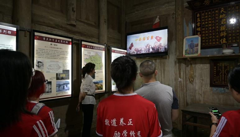 7月8日中午,经过五个多小时的跋涉,本团队抵达黄家镇。简单整顿后,团队成员跟随先锋社区负责人王正琴的脚步,来到了红军历史陈列馆。负责人为我们详细介绍了红七师机炮连一排与黄家镇的军民鱼水情——“一张留言条”故事的历史渊源,“老板:我们吃了你半坛咸菜几根大葱,烧了几根柴,共补你黄豆六升”。在彭水黄家镇,村民黄学珍家的门板上一直贴着这张泛黄的纸条。