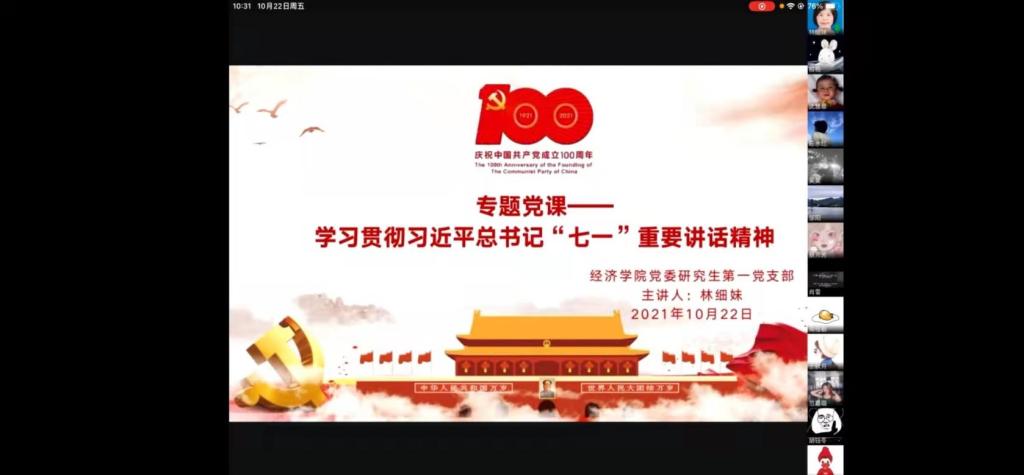 10月22日,委研究生第一党支部在线上召开了以“学习贯彻习近平总书记‘七一’重要讲话精神”为主题的专题党课学习活动。此次党课由支部书记林细妹主讲,支部全体成员参加。