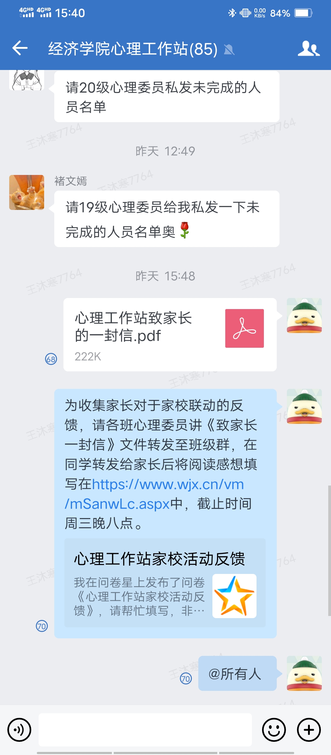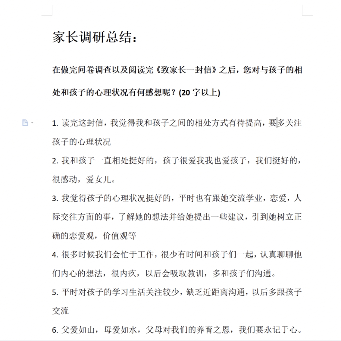 基于家长们的积极回应参与,心理工作站了解到家长们对此活动认同度较高、感触较深,有家长反馈:“很多时候我们会忙于工作,很少有时间和孩子们一起,认真聊聊他们内心的想法,很内疚,以后会吸取教训,多和孩子们沟通”,“能参加这样有意义的活动我很开心,孩子心理很健康,我也需要也多多沟通,孩子也喜欢事情多交流,以后也会多多注意孩子的心理健康问题”,“首先感谢学校和老师员工心理健康的关注。员工家长们纷纷表示,今后除了继续关心孩子的学习、生活情况外,同时也要注重关注孩子的心理状况、情绪变化等,积极沟通,正面引导,让孩子健康,阳光地成长。